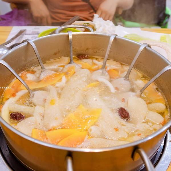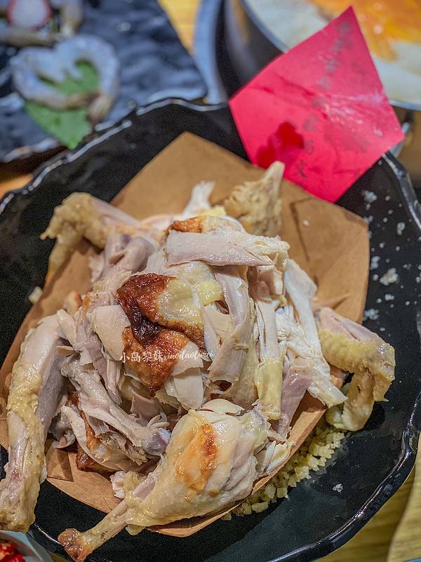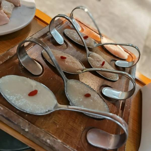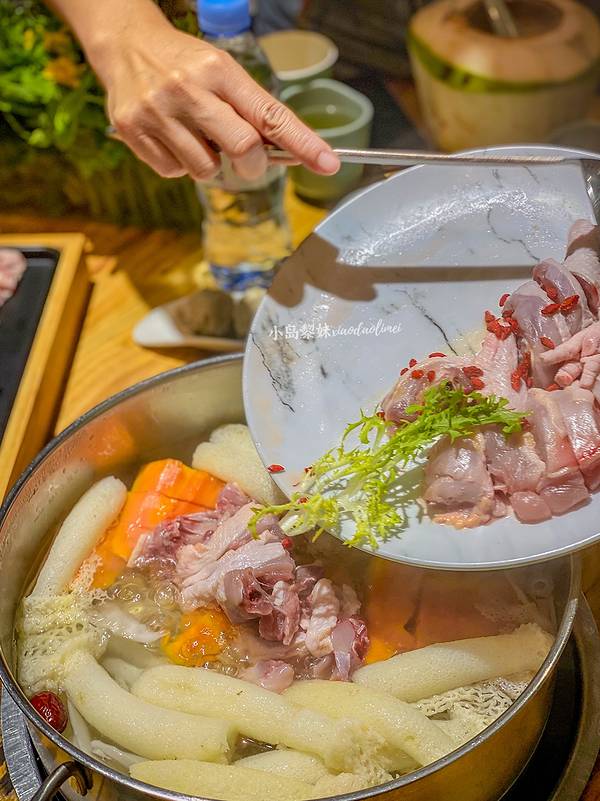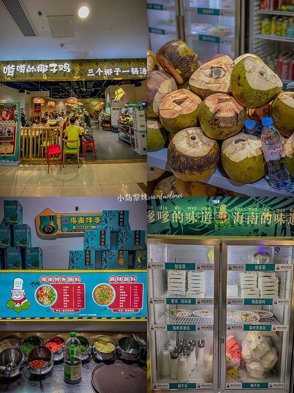 嗲嗲的椰子鸡 海南特色椰子鸡。吃了几家觉得嗲嗲的鸡肉是最鲜嫩的,也有在家里尝试做过,毕竟食材都是非常简单的,但是市场上的鸡肉没有他家的好吃。店员说他家的鸡场养鸡是养足150天,并且所有鸡只吃椰肉。怪不得连鸡皮都觉得挺Q弹的。汤底是三个青椰的椰子水+一点条形椰肉+几颗马蹄+ 一点点枸杞。 如果怕汤太甜店员会给你加一瓶依云矿泉水。椰子鸡的原则是到时间先吃鸡,免得鸡肉会老,后喝汤,喝完汤再去煮其它的。 建议人多的话点两大份鸡肉,是非常满足的。除了鸡肉以外,我觉得竹荪,马鲛鱼滑是必点。虾滑家家一个味儿,可以略过。