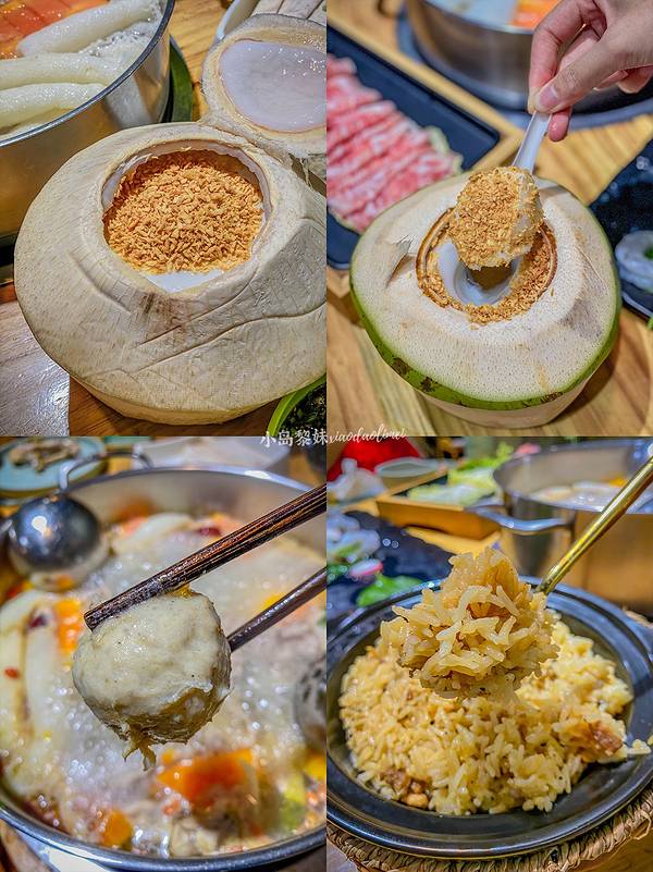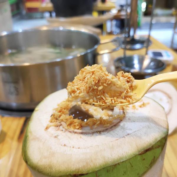 庆幸我们来的早,不然就要等位啦!还没进到店里,就发现满满的吃客在向里走,环境:整个店的风格偏田园,有着时尚、简约、现代感的合集,以木制结构书架式的装饰摆放在进门处,不近看里面的餐桌,还以为进了什么好看又精致的书店。 一块隔着玻璃的超大椰子地盘吸引了我,真的好多个大的椰子,全用铁框装着,让我想起了篮球,也是这样为了防止它乱跑,椰子水是很美味的一种天然饮品,由其是在夏天,抱上一个椰子感觉一整天都舒心了,嗲嗲椰子鸡家的椰子可是大有来头,在海南三亚北纬18度的地方,有着山海田野间的天然美味食材,那就是海南四大名菜之的文昌鸡和东郊椰林的椰子,没错,这里的椰子和鸡都是来自那里,纯天然的食物,想一想都流口水。 汤底食材⽵荪木瓜,第一次这样吃,纯野⽣的⽵荪营养丰富,⾹味浓郁,滋味鲜美,⾃古就列为“草⼋珍”之⼀,⽵荪搭配海南水果中的有机木瓜,不仅可以提升汤的清甜鲜美,女生喝了还可以美容养颜,在加上原味椰子鸡,味道会更加营养美味。 极品雪花肥牛:火锅中不可缺少的一道菜,大理石纹的雪花牛肉油花丰富,切得薄厚均匀,等到椰子鸡吃完后在下肥牛,用纯香的锅底煮出来的牛肉汁渗出,口感鲜嫩不老,且并不会偏甜,另外还配有特制酱料,吃起来极其美味。 海南带皮小黄牛:小黄牛是海南省著名的菜品之一,名气都已传至东南亚,美味的小黄牛加上香醇的山兰酒,早已紧紧拽住了不少食客的胃,带皮入口,牛皮脆而爽,肉更是鲜香软嫩。 海南野⽣⻛尾虾:海南的野⽣凤尾虾,虾⾁洁⽩、尾壳鲜红,外形似凤尾,虾⾁营养丰富,而且肉眼可见虾处理得非常干净,可以放心的食用,⼝感更是Q弹爽滑,⼊⼝即化。 嗲嗲⼿打⻢鲛⻥滑:选⽤深海⻢鲛⻥,⼿⼯打制,⻥滑的⾜够⻥⾁弹滑,新鲜实在,上⾯的⻥籽赋予味蕾微妙细腻的层次感,Q弹精韧。