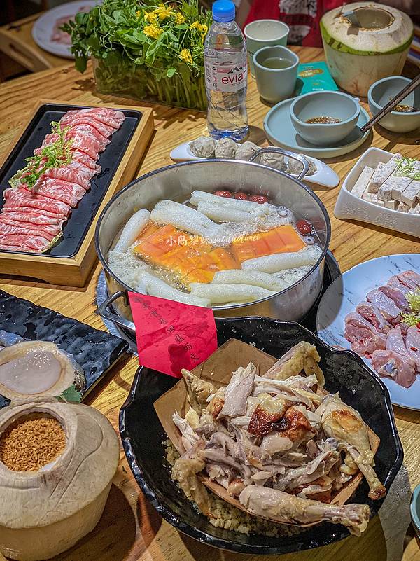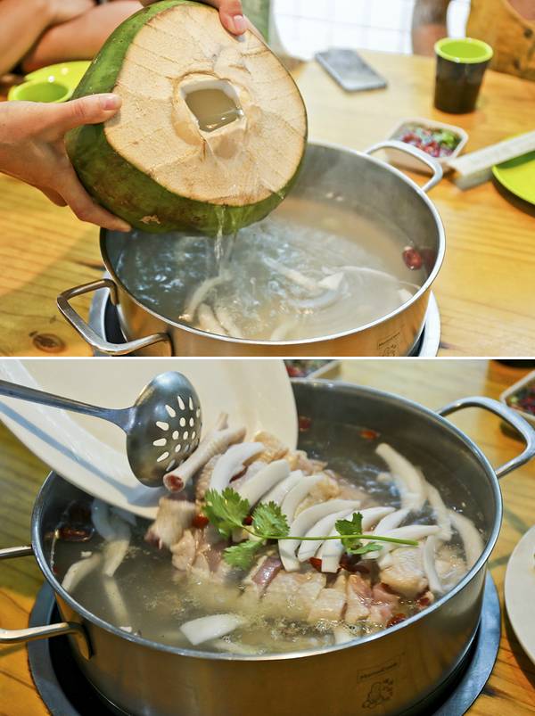 如果怕汤太甜店员会给你加一瓶依云矿泉水。椰子鸡的原则是到时间先吃鸡,免得鸡肉会老,后喝汤,喝完汤再去煮其它的。