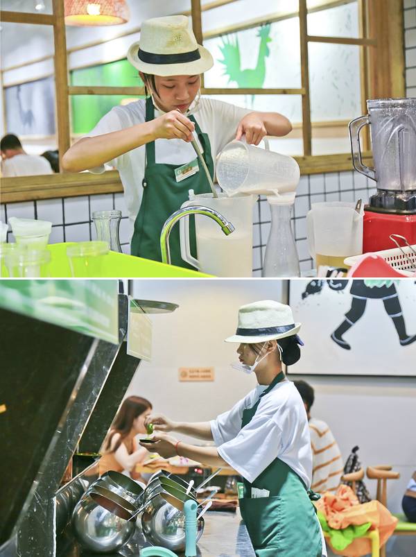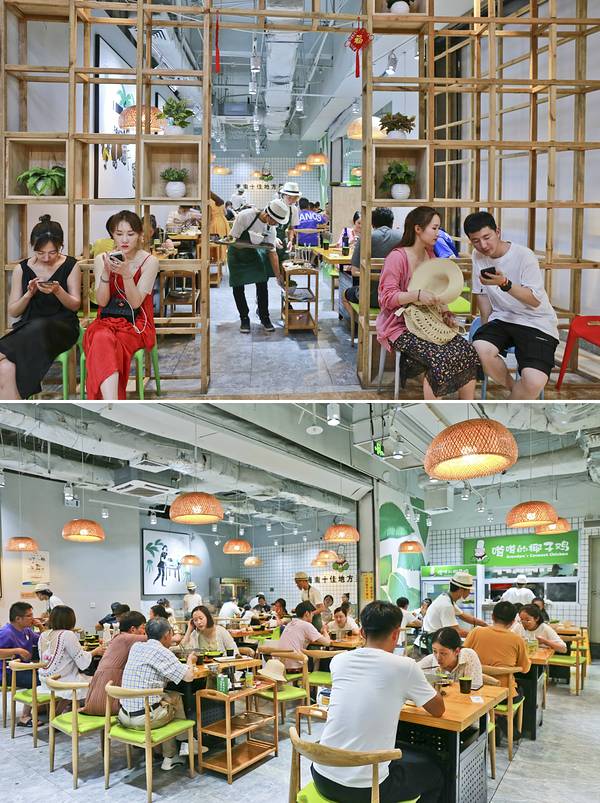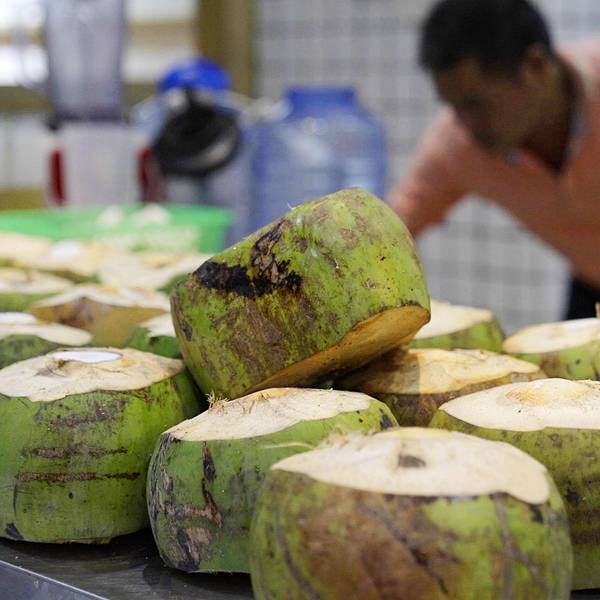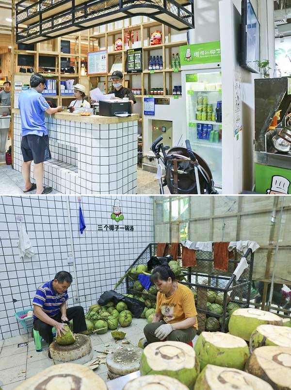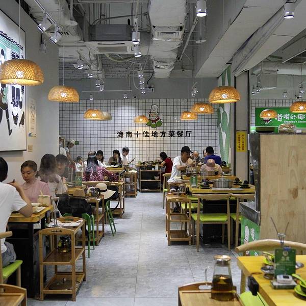 门口硕大的招牌很是醒目,让人驻足;悬挂着的电视里一直循环播放着关于椰子鸡的由来等等……等待的间隙,忙不停的伸头探向店内,服务人员有条不紊的忙碌着,或上菜、或为客人调着调料……一侧码放着说不清的椰子,被开过的堆在一起,一旁开椰子的工作人员也是忙的不可开交。几个椰子下来,就已经一桶的椰子水了。说到嗲嗲的椰子鸡,在海南,“爷爷”会被唤作嗲嗲,于是这嗲嗲的椰子鸡,也便是爷爷的椰子鸡。其实,更多的是想要体现着最淳朴、最地道的海南当地美味,用真挚的初心传递给来海南旅行的游人。店内的装修风格,也与此理念相匹配,轻时尚、轻简约,旨在打造一个轻松舒适的就餐环境,让美味得到最大程度的展现。