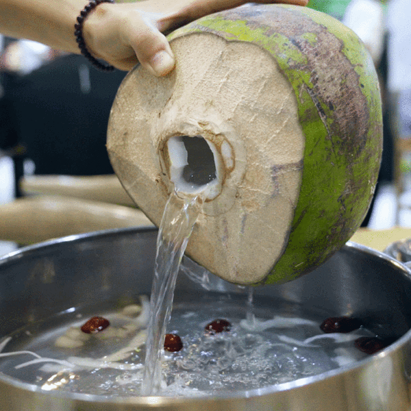 将新鲜的椰子撬开一个小口,将椰汁直接倒入锅中,作为汤底,等待开锅加海南特有的文昌鸡肉,计时器倒计时三分钟,归零后即可开盖捞出食用,且此时口感和味道最佳,再沾上服务员帮忙调制的特色酱料,入口味道非常...