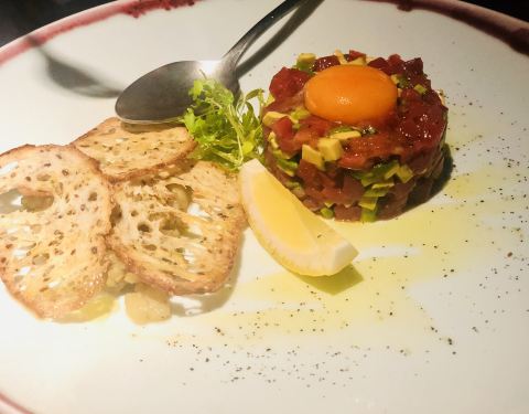 本来想来挑战战斧,量实在是大~ 换成858米的澳洲和牛m5+花纹肉眼牛排500g~ 金枪鱼塔塔满满一盘,食材可~塔塔调的也ok~面包片下面有蘑菇~蟹肉饼是蛮喜欢的一道菜~牛排足够双人share了~搭配点的土豆泥一起...本来想来挑战战斧,量实在是大~ 换成858米的澳洲和牛m5+花纹肉眼牛排500g~ 金枪鱼塔塔满满一盘,食材可~塔塔调的也ok~面包片下面有蘑菇~蟹肉饼是蛮喜欢的一道菜~牛排足够双人share了~搭配点的土豆泥一起送上~3分熟~整体尚可~ 服务略有跟不上,点了一杯tommy玛格丽特还被漏单了~微微小薰~