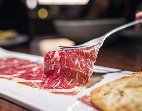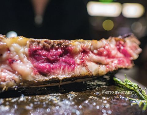 冲着牛排而来,我眼盯的自然是这里当仁不让的主秀。想不到不管是前菜还是甜品,这里的每一道都足够的惊艳,怪不得常来这里的好友特地开了好酒,不紧不慢地压着酒聊着天,那份淡定仿佛一切尽在她的掌握。好吧,即来之则安之,随着一道道菜品的款款而来,心情也悠哉乐哉随之荡漾。 生蚝拼: 来自法国的两款生蚝,听来有些陌生的糖果生蚝,大名赫赫的吉拉多1号,这一大一小围卧在冰面上,在柔弱的光影里闪着晶莹。挤上些许的柠檬汁,还有店家特调的红醋汁,一昂头一吮吸,那肥厚的蚝肉便滑进了嘴里,伴着那份咸口的海水味,咀嚼到的却是柔嫩间的清甜,鲜活才有的好口感,难得我一连吞了三枚,意犹未尽。 意大利薄切生牛肉: 换作平日里,我只在意牛肉的品质,还有开切薄片的漂亮纹理,想不到让我两眼放光的何止这些,那大片大片的白松露,把牛里脊湮没在若隐若现里,这份霸气的舍得,让我惊诧得窒息。 和牛火腿: 只是一道前菜,却用了整整36个月的和牛M9,嚼着那满口的熏香,那明媚的脂花在齿间跳着舞飞着吻,真的让人心花也怒放。把干白直接换成了干红,唯有足够的单宁馥郁,才衬得起那年份堆积起的厚重肉香。 烟熏三文鱼沙拉: 清新清甜的混合蔬果,合着稍显重口的辣蕃茄酱,倒是吊足了胃口,块状的烟熏三文鱼表层薄薄的脆口焦香,里内却是柔嫩得如同刺身,在这个渐凉的深秋,倒是看似淡妆沁人,吃来浓香入味两相宜。 主菜牛排: 美国T骨牛排和澳洲M7和牛战斧 我期盼的主秀终于粉墨登场了!想不到,那一头的T骨高傲地屹立着,如同佩戴着宝剑的剑客一般,威风凛凛。这一头的和牛淡定地横卧着,如同出征前的将军手握着战斧,气宇轩昂。这强势对垒到底哪般更甚?! 要说这和牛脂质饱满奶香悠然,这T骨嚼劲十足牛味深重,真心不分伯仲,只是个人更偏爱美国牛肉的质感,还有那越嚼越馥郁的牛香。 甜品: 别以为只是个甜蜜的收官,从嫩滑飘然的焦糖布丁到回味绵长的厚芝士,绵密醇厚的栗子蛋糕,到弥漫着薄荷清香的冰棒,再到焦香脆片下的浓重太妃巧克力蛋糕……由浅至深,由轻至重,哪一道都让你留连忘返,停不下来的节奏,skr!我能再来一杯咖啡吗?!