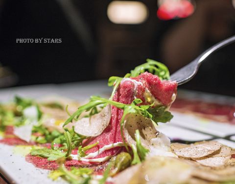冲着牛排而来,我眼盯的自然是这里当仁不让的主秀。想不到不管是前菜还是甜品,这里的每一道都足够的惊艳,怪不得常来这里的好友特地开了好酒,不紧不慢地压着酒聊着天,那份淡定仿佛一切尽在她的掌握。好吧,即...冲着牛排而来,我眼盯的自然是这里当仁不让的主秀。想不到不管是前菜还是甜品,这里的每一道都足够的惊艳,怪不得常来这里的好友特地开了好酒,不紧不慢地压着酒聊着天,那份淡定仿佛一切尽在她的掌握。好吧,即来之则安之,随着一道道菜品的款款而来,心情也悠哉乐哉随之荡漾。 生蚝拼: 来自法国的两款生蚝,听来有些陌生的糖果生蚝,大名赫赫的吉拉多1号,这一大一小围卧在冰面上,在柔弱的光影里闪着晶莹。挤上些许的柠檬汁,还有店家特调的红醋汁,一昂头一吮吸,那肥厚的蚝肉便滑进了嘴里,伴着那份咸口的海水味,咀嚼到的却是柔嫩间的清甜,鲜活才有的好口感,难得我一连吞了三枚,意犹未尽。 意大利薄切生牛肉: 换作平日里,我只在意牛肉的品质,还有开切薄片的漂亮纹理,想不到让我两眼放光的何止这些,那大片大片的白松露,把牛里脊湮没在若隐若现里,这份霸气的舍得,让我惊诧得窒息。 和牛火腿: 只是一道前菜,却用了整整36个月的和牛M9,嚼着那满口的熏香,那明媚的脂花在齿间跳着舞飞着吻,真的让人心花也怒放。把干白直接换成了干红,唯有足够的单宁馥郁,才衬得起那年份堆积起的厚重肉香。 烟熏三文鱼沙拉: 清新清甜的混合蔬果,合着稍显重口的辣蕃茄酱,倒是吊足了胃口,块状的烟熏三文鱼表层薄薄的脆口焦香,里内却是柔嫩得如同刺身,在这个渐凉的深秋,倒是看似淡妆沁人,吃来浓香入味两相宜。 主菜牛排: 美国T骨牛排和澳洲M7和牛战斧 我期盼的主秀终于粉墨登场了!想不到,那一头的T骨高傲地屹立着,如同佩戴着宝剑的剑客一般,威风凛凛。这一头的和牛淡定地横卧着,如同出征前的将军手握着战斧,气宇轩昂。这强势对垒到底哪般更甚?! 要说这和牛脂质饱满奶香悠然,这T骨嚼劲十足牛味深重,真心不分伯仲,只是个人更偏爱美国牛肉的质感,还有那越嚼越馥郁的牛香。 甜品: 别以为只是个甜蜜的收官,从嫩滑飘然的焦糖布丁到回味绵长的厚芝士,绵密醇厚的栗子蛋糕,到弥漫着薄荷清香的冰棒,再到焦香脆片下的浓重太妃巧克力蛋糕……由浅至深,由轻至重,哪一道都让你留连忘返,停不下来的节奏,skr!我能再来一杯咖啡吗?!