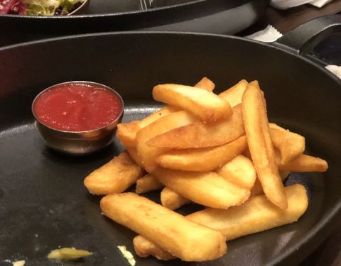 每个月都能跟着老板吃一次!我们11个人坐在大堂的一个角落,离其他有客人的桌子都挺远,整个餐厅也很安静。11个人先点了2个战斧,2份火腿拼盘,2份薯条,每人2个生蚝。薯条1份甜的1份咸的,甜的刚吃很好吃,但是...