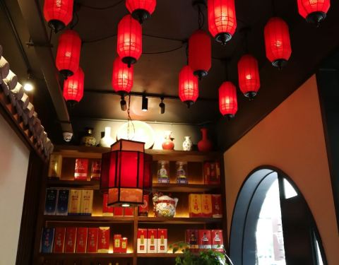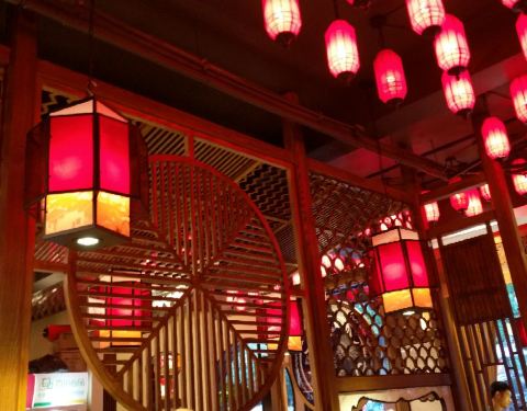 ...里满满的红灯笼布置,人气挺足,菜品的摆盘很精致,装菜品的容器图案都很美貌很精致,菜品的价格实惠