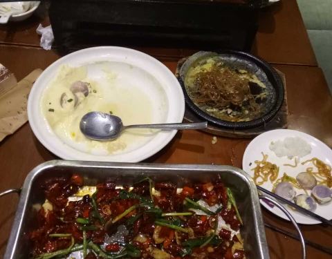 用餐人数比较少 店里的空调都没怎么开 还好阿拉提了意见服务员立马开了空调 本来想点榴莲椰奶汁的 下单以后厨房告知榴莲木有呐 只能放弃重口味了 ⊙﹏⊙ 泡脚凤爪 泡脚味道腌制的很入味 凤爪皮Q弹的 味道不错 干锅千叶豆腐 千叶豆腐的口感有韧性 久煮也不会碎烂 就是口味挺辣的 蒜茸娃娃菜 喜欢上面的蒜茸 跟蒜茸生蚝那种配料一样 很鲜美 伴着粉丝吃哈嗲#^_^# 葱花煎蛋饼 很简单的一道菜 鸡蛋遇油就是很香 好吃!╰( ̄▽ ̄)╮ 火焰虾 推荐第一的菜 自然是要点来尝试一下的咯 上来用锡纸包着 服务员会帮忙死开 里面的虾去头 可以连壳一起吃 虾壳的脆香味陪着里面带丝甜味的虾肉 值得一试呢~ 千岛湖酸菜鱼 里面的鱼片口感很嫩 酸菜也好吃的 味道最浓郁的是汤底 小伙伴喝的好欢乐