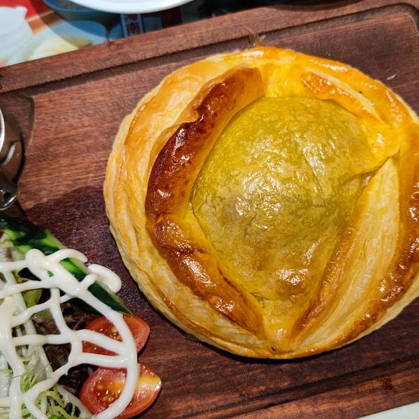 黯然销魂饭 ✨叉烧软糯又特别的入味,蛋黄流入秘制的饭里,味道相当棒。 小熊冻柠茶 ✨奶香味挺足,加上小熊冰块,特别的清爽小吃拼盘 ✨点一个小吃拼盘,鸡翅、小鱼丸、小香肠、混酱肠粉,可以多尝尝各种美食。暴富漏奶华 ✨这也是必点的甜品,一张麻将发财的巧克力,想发财的必点。切开以后里边的奶华都流出来了,味道和口感都超级棒。惠灵顿牛排 ✨这道菜上的比较慢,但味道超级好,外酥里嫩。