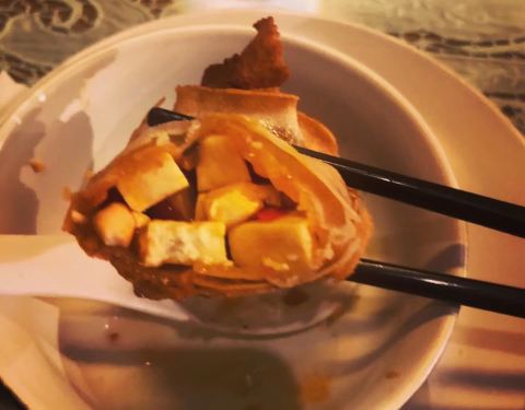 #让人处处有惊喜的素食馆 一个手卷三种不同滋味 麻婆豆腐春卷 蛋糕味道的芝士番薯