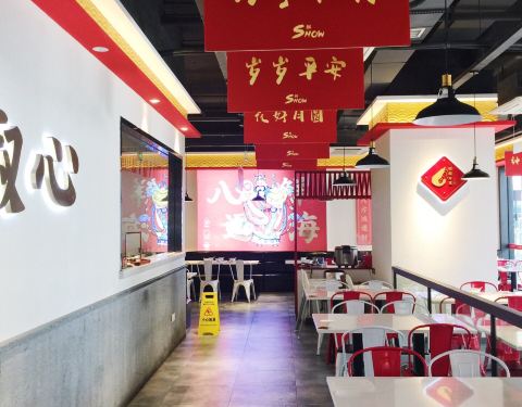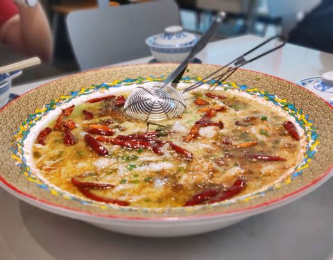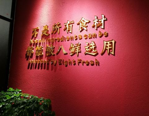 八鲜过海位于东海泰禾广场5楼,从1.2号电梯可以直达,附近有姜虎东。 店铺大量采用中国红,很是喜庆。进门还可以看到霸霸和绿巨人在话仙。 上座是用茶盏盛的八宝茶,纸张用的是维达手帕纸,很是阔气。虽然人多,等待时间并不长。 |招牌酸菜鱼^酸菜鱼端上来香气扑鼻,超级大盆,份量很足,很是让人食指大动。鱼肉无刺鲜滑,薄而大片,极品美味。鱼肉也非常嫩,嫩到用筷子都无法轻松夹起。配上的龙口粉丝,也是非常顺滑好吃。 |八鲜凉面^四小碗一两口量,添加少许佐料,很好下口,味道也不错。 |好吃的鸡爪^小火保温,吃起来软烂入味,有点小时候家里卤鸡爪的味道,蛮好。 |豆豆丁丁^小缸装,很有中国味。浓稠的豆花点缀少许的蜜汁,甜甜带有点冰爽感。饭后来一口,解腻又满足。 |椒香杏鲍菇^杏鲍菇切薄片且入味,味道其实挺赞。但中间混杂些黑点异物略磕牙,难以尽兴品尝,建议改进。 总体来说,性价比很高,又好吃的酸菜鱼店。