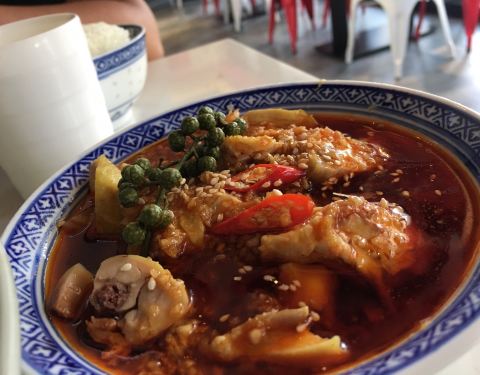 八仙过海 位置: 泰禾广场小龙坎楼上 (入口在金街,不在室内) 酸菜鲈鱼,挺大一份,我们3个人吃,差不多, 挺辣的,川菜,不过味道很好,朋友说一遍流鼻涕一边还吃。 八鲜凉面,味道真的好,一两口差不多,很香,不过就是很辣哈哈。 晚上来挺多人的,新开的店,环境不错,开放式的厨房让人放心。