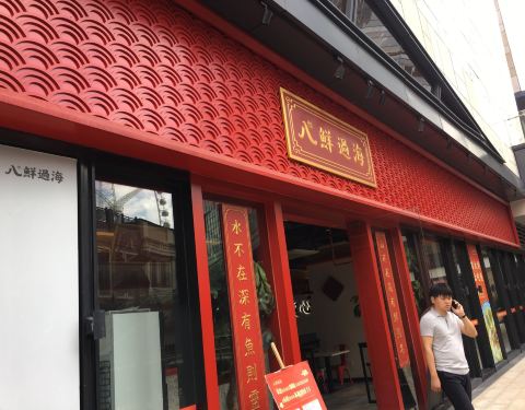 八鲜过海位于东海泰禾广场5楼,从1.2号电梯可以直达,附近有姜虎东。 店铺大量采用中国红,很是喜庆。进门还可以看到霸霸和绿巨人在话仙。 上座是用茶盏盛的八宝茶,纸张用的是维达手帕纸,很是阔气。虽然人多,...