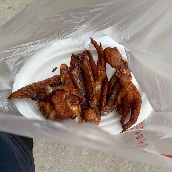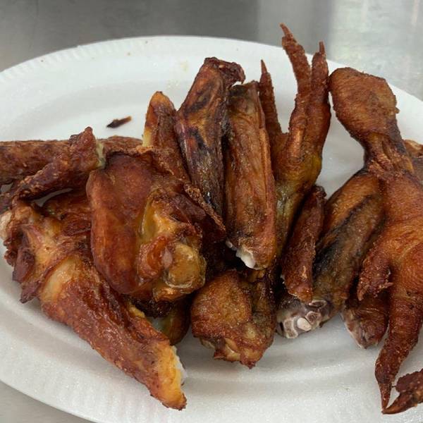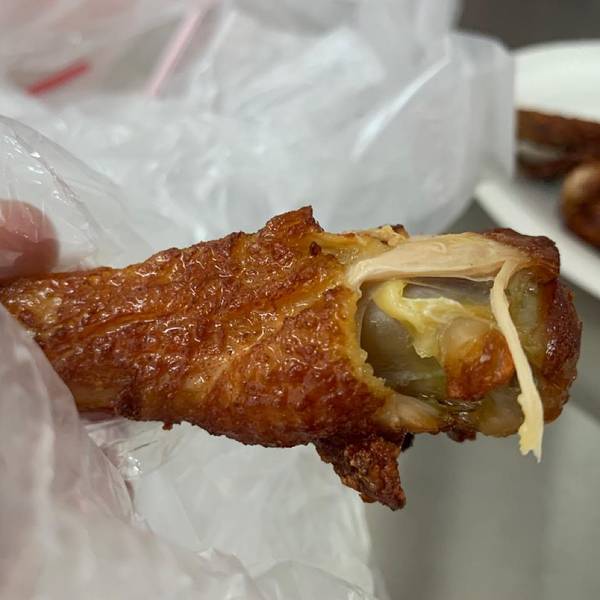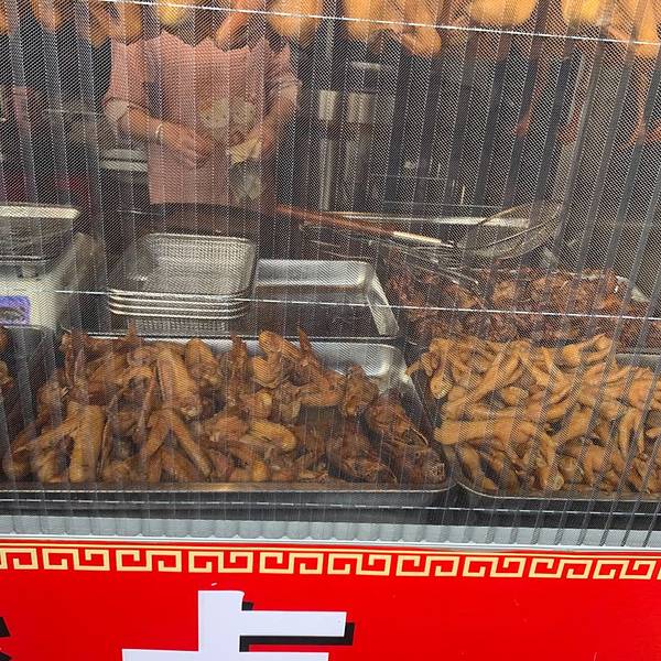 菜场门口得烧卤档,仅提供外卖,无堂食的空间。店铺招牌之下悬挂了10多只鸭子,气势撼人,心想一天能卖出这么多只吗?会不会售卖过夜的鸭子?在等待现场炸制的5分钟内,就有看到超过5位市民前来购买,从点单的口气上听出,都不是第一次购买了,而是熟客,这才让我打消了刚才的顾虑。 他家有鸡爪、翅中、翅尖、鸡腿等单品,一样要了几个,算下来才30多块,价格适中。用发泡盘子盛装,套上塑料袋,简单得不能再简单的包装方式。 提入车中,一会车里的香味就扩散开了。先卤后炸的做法不仅将卤味牢牢锁住,油炸的过程还能增香增脆,让口感锦上添花。卤过的口感和洋快餐的完全不一样,不仅是表皮香糯,内部的肉质仍然鲜嫩。再配上可乐的话,就成了解馋神器!