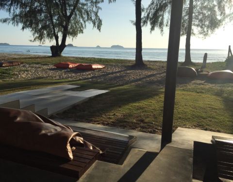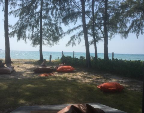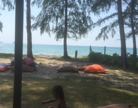 又来了一次,非常适合正午时间吃点东西懒散一下。这次有食物的照片了。一颗新鲜椰子和一杯热卡布和一个蓝莓起司蛋糕共270泰铢享受懒人沙发和无限海景。值。
