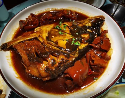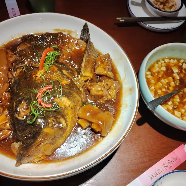 地理位置比较好,鲁迅故里景区出来便是,这次来绍兴一路上看到很多寻宝记的广告,所以就来打卡了。店内循环放着绍兴戏唱段,桌椅也是古色古香很有韵味。点了几个招牌菜,花雕醉鸡,肉质比较嫩,酒醉的程度不算浓郁,整体口感略咸;招牌酱鸭量很大,鸭肉挺细腻的,而且味道渗透感很强;西施豆腐入口即化,搭配勾芡的酱汁挺有回味感的;还点了个绍兴传统的蒸臭苋菜杆,虽然闻起来有点重口味但却是儿时吃过的那个味道,另外他家的黄酒棒冰也挺好吃的。
