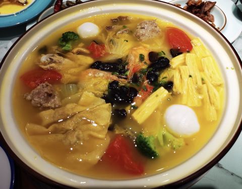 来到绍兴当然要尝尝当地的特色美食了,这家店门口就写着“绍兴人吃了17年的老馆子”。 【服务】扫码自助下单还是很方便的,上菜速度有慢,还有带提高。 「绍三鲜」当地必吃菜,量很大,品种挺丰富的,鱼丸、猪肚、火腿、鸡、虾等等,真的很鲜美~不过和在上海吃的三鲜汤差不多。 「绍兴醉鸡」鸡肉很嫩~而且醉的很入味~一份量也很足。 「桂花米酒」米酒甜甜的,带着桂花香~这个酒还是有点后颈的,对于不胜酒力的我尝尝味道就好,千万不能贪杯哦。 绍兴最有名的就是黄酒了,店里还有互动环节,可以免费品尝他家十年陈酿的黄酒~还能欣赏越剧表演