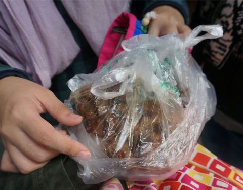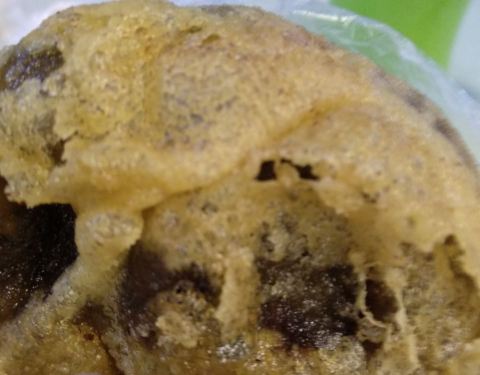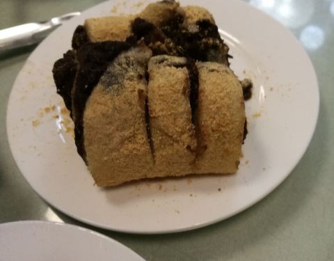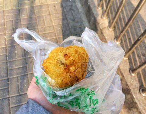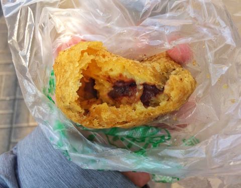 - 炸糕到手之后肯定是要当场解决,外皮果然特别的脆,里面还有点中空,口感特别滑,豆沙的甜味也挺合适的