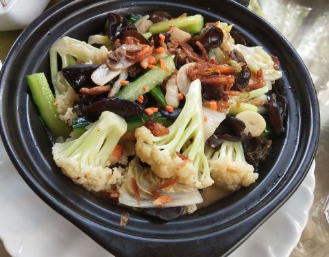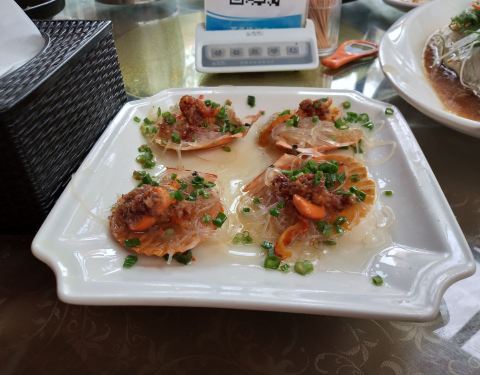 闺蜜家附近的海鲜酒楼,被安利来吃的,两个妹子买了个双人团购券,吃得饱饱的! 最满意的就是他们家自带一个大院子,免费停车,有划线,很科学,就是不要钱,太壕了。真羡慕岛外人民!地广人稀! |文蛤豆腐汤^加了芹菜不是很爱,但是文蛤很肥! |杂菜煲^比较油一点,但是超级香,非常好吃,烫嘴也要吃的那种!花菜是主打,其他切得比较细。 |粉丝蒸扇贝^味道很正,新鲜的扇贝! |红烧鱼^本来是清蒸,不知道为什么换红烧,刚好下饭。非常非常入味,入得有点太咸,但是鱼非常新鲜,绝不是用咸遮盖不新鲜的那种情况。不过吃完还是有点怀念清蒸呢~ |炒黄豆^非常香,很脆,大爱的小菜! |拍黄瓜^不是很入味哦,只尝了一口。 |水果盘^果盘也不错,盖保鲜膜放冰箱的。 店内有电梯,五层楼,每一层的功能和档次都不一样。时间关系没有上去参观,下次再来吧~