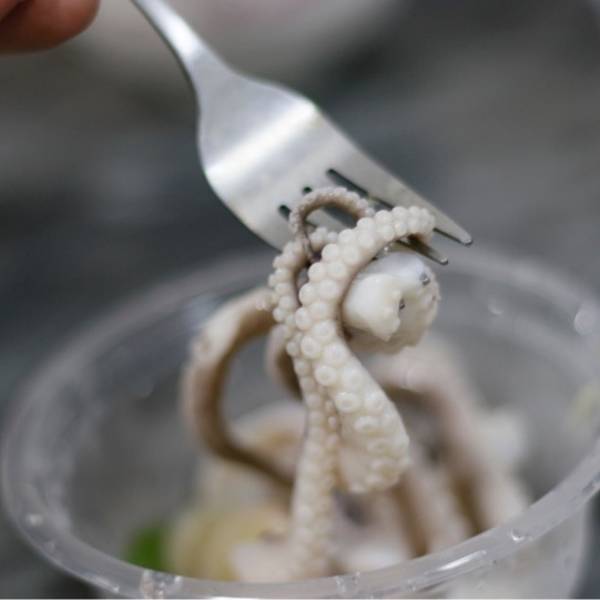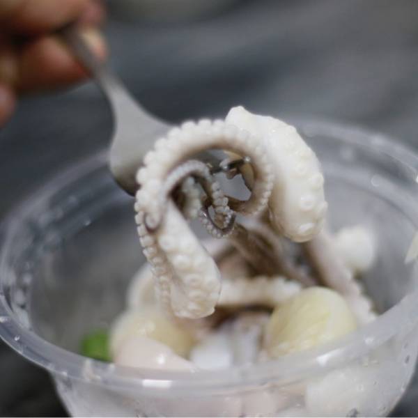 ...鱼」白白胖胖的,历经搓细、白灼、冷敷、冰镇等几道工序,章鱼的爪很弹牙,章鱼头内馅紧实,口感满足