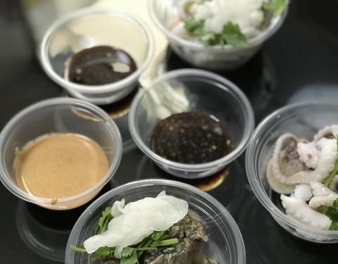 细嫩脆爽的「章鱼」白白胖胖的,历经搓细、白灼、冷敷、冰镇等几道工序,章鱼的爪很弹牙,章鱼头内馅紧实,口感满足。铭聚配上的蘸料有酱油味的和芝麻味的。