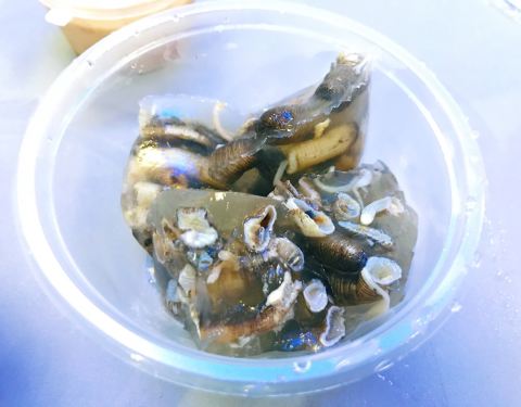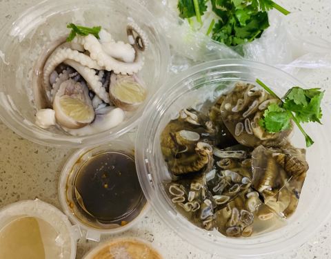 屿后南里公交车站边上,不大的一个小店,门口的冰柜有土笋冻章鱼等特色小吃,看到很多学生来买,看来这种接地气的小吃很受学生和顾客欢迎。 点了土笋冻和章鱼,店家帮忙调好了料,萝卜酸芥末香菜等等,土笋冻用料实在,里面满满的沙虫,冰凉Q弹胶质丰富,口感真是不错一下子就吃光光。章鱼脆爽鲜甜,有些还有膏。这两样出品都很赞,下次还会再来。