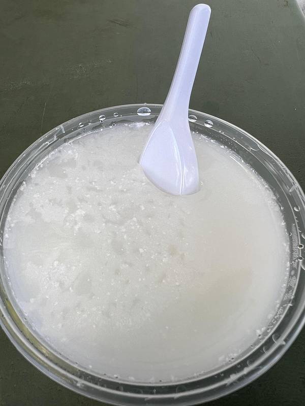 其实在这边除了陵水酸粉之外,还有其他的海南小吃也是相当不错,例如说椰子冻,还有这边的柠檬茶。 椰子冻是一早就做好的了,所以还是比较的快捷就上了,上面可以加点类似于加在清补凉上面的一些配果,花生仁啊,葡萄干之类的,要你的椰子冻多一点其他的美味,椰子冻本身就相当的不错,很正宗。