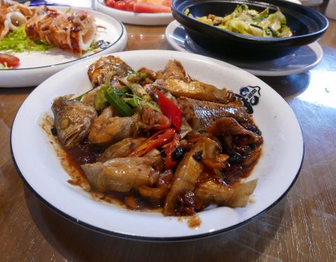 这家鼓厝海鲜煎蟹鼓浪屿里面的标地店了,生意很不错,人很多正宗的闽南口味,很多当地人的最爱。 离内厝澳码头入口很近,直走上坡不到5分钟路程左拐上行就可以看到一个标志性的一颗大榕树,很有意境,很有很多抱枕和坐垫可供休息,很清净舒适的感觉。 饭店环境很敞亮,室外也可以就餐,很有感觉。 不得不说饭菜真的很实惠,很大份,团购了一个双人餐,3个人都吃的饱饱的,性价比可谓之高。 |酱烤东山海钓大管^是我吃过最好吃的大鱿鱼,甜甜口感,鲜香的鱿鱼,食材真的很新鲜,应该喜欢吃海鲜的都抗拒不了这种口味。 |铁板海鲜炒饭^真的很舍得放料,口口都有海鲜 |红烧昌鱼^不腥不腻,鱼肉很嫩 [服务]非常良好,很热情招待