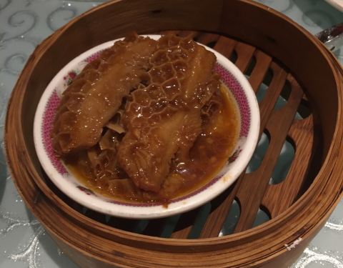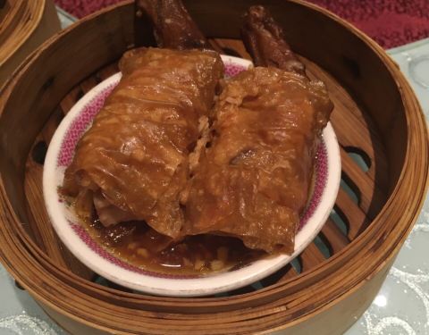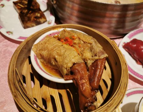一家五口人的早茶,一壶茶、一些点心,别的可以少吃一口,鸭脚扎得一人一支。没点粥粉面,来口打边炉煮半只猪肚鸡,煮绣球菌、丝瓜、鲮鱼酿豆腐,吃得刚刚好~