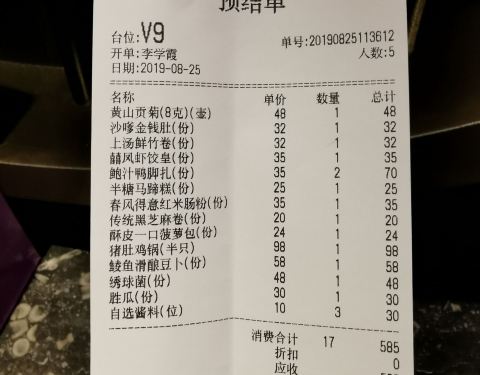 一个星期前预订的座 到那的时候太早了还没有什么人 [环境]环境很好 很有港式的范 放的歌什么的都很有情调 花胶鸡,这个花胶鸡一百昏 端上来以后浓浓的香味 一点都不油 服务员会把表面的浮沫给弄出来 然后给盛汤 花胶一点都不腥 粘嘴巴 能够明显吃出来胶原蛋白的感觉 鸡肉也不柴特别嫩 五星推荐! 白糖糕,白糖糕有股米酒发酵的感觉 就像小时候吃的发糕 喜欢这个味道人会喜欢 不喜欢的就不会爱吃了 口感q弹 四星 鲍汁鸭脚扎,这个里面料很多 有芋头虾仁啥的 但我个人不是很喜欢这种混合的味道甜咸甜咸的 三星 砂锅腊味糯米饭,这个饭里很多香菜 不爱香菜的人一定要提前说 说是腊味 其实我并没有吃出腊味来 可能我比较口重 口淡的人可以试试 三星 鹌鹑蛋烧麦,这个里面是一颗整个的鹌鹑蛋还有虾仁啥的 厚了点面皮硬了点 感觉蒸老了 口感不大好 两星半不推荐 一口酥菠萝油,菠萝油很好吃 一口一个感觉吃不够 黄油和面包是分开的 黄油单独包着放在冰块上的 这个要给四星 美中不足就是太小不够吃 炸两,这个就是肠粉包着油条 酥酥脆脆的 三星半 煎萝卜糕,萝卜糕好吃 蘸着酱不会觉得腻 四星 叉烧包,叉烧包就跟很多港式餐厅的味道一样吧 不过不会太甜 也很好吃 值得一点 四星 想吃点心的话就中午来 花胶鸡要提前打电话预订 半只298 喝汤吃点心就行了不用点涮菜 也是要早点来 到了饭点要排队等座 还是比较推荐的 我是湘妹子 跟我一样口重只能吃辣的人就不推荐了会觉得腻 毕竟我就被腻到了 环境服务没的说