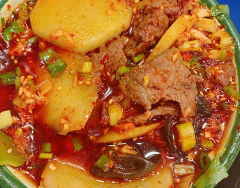 【冒牛肉】 牛肉片很嫩很香辣入味,可惜量太少,一人一片就没了,垫底的是土豆片,略带脆口的那种