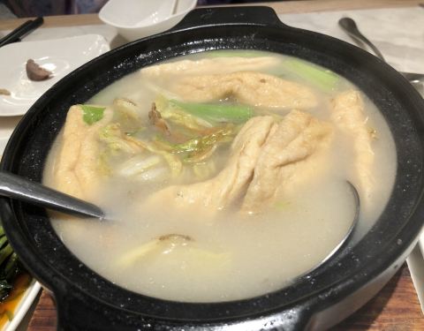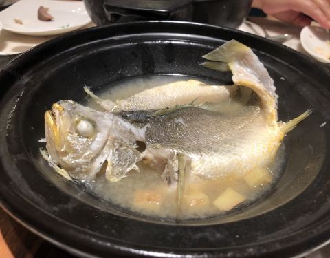 招牌菜砂锅煨的黄花鱼也不算惊艳。上汤菠菜和马来空心菜不错,荔枝肉其实就是菠萝咕噜肉,一般