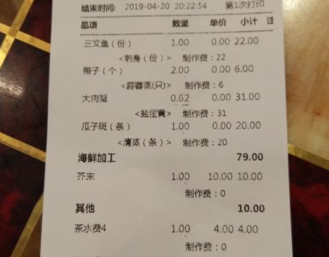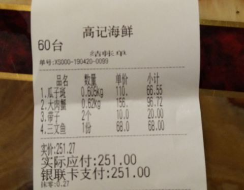 周末时懒得做饭,想着很久没去海鲜市场觅食了,就带着老婆去了这里。再次来高记才发现好像重新装修过,似乎大厅比以前更宽敞更明亮!此时客人还不多,选定了位子我便马上去挑海鲜,生怕过会人多了,上菜得够咱们等的。看着三文鱼品相还不错,又全是切成68元一包的独立装,份量较适合两人的,于是点了一块;瓜子斑以前没吃过,看在水中的样子挺有活力,挑了一条;大螃蟹张牙舞爪似乎很诱人,也选了一只;为了凑个双数,接着又点了几个带子。四样东西(不含税票)买单价250多元,还算比较合理!回座位只等了不到二十分钟菜就上齐了,此刻大厅里几乎已坐满了人,服务人员就显得有些手忙脚乱了,这证明咱时间掐得准,这会我还挺得意!三文鱼刺身、咸蛋黄焗蟹、青蒸带子味道还算中规中矩,但青蒸瓜子斑却很差劲!挑鱼时看着活蹦乱跳的,端上桌却是松松散散,肉质既无新鲜劲也没入味,我俩有些怀疑食材是不是被厨房调包了?同时鱼的汤汁还偏多,冲淡了味道。一看就是让蒸汽回流到菜盘里了,不但浪费了食材还要收20块加工费,真是感觉不爽!最后七七八八的费用又收了近百块,顿时又感到有点不值了!