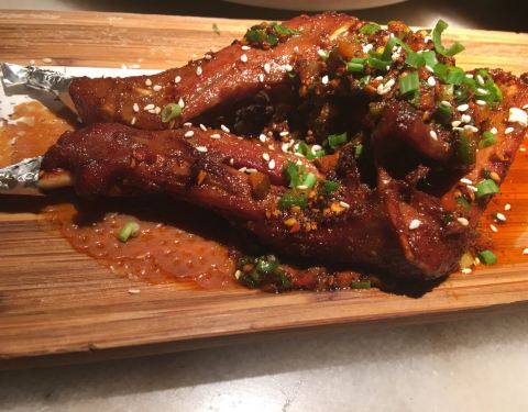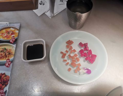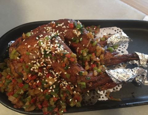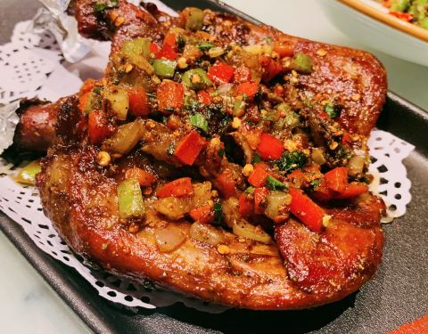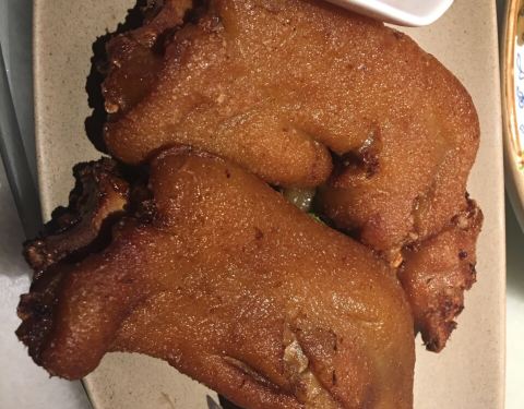 7点半左右去的,客满,前面有两桌人在等位,取了号,在外面边等边看菜单。等位的时候有免费的金桔茶喝,挺不错的。门口还可以免费转一次大转盘,我们转到一个自制酸奶,真幸运!两个人很奢侈的坐了一张大圆桌,之前来过一次了,所以这次点了不同的菜品。原本点的小油条结果卖完了,因此还是换成了咸蛋黄锅巴。 【咸蛋黄锅巴】端上来一股香味四溢,一如既往的好吃。 【夫妻肺片】凉菜,由于肚子太饿,对这个一阵狂吃,味道稍微有点辣,偏咸一点点,不过东西还是挺不错的,料足。 【热恋椒麻鱼】盘很大,上面飘了一层的花椒和芝麻,丝瓜挺多的,也很入味,鱼片肉质的口感很厚实,不过量一般,不是很多,性价比不太高。 【烤猪蹄】¥16/半只,一人点了一个,猪蹄很大个,看上去就很有食欲。猪蹄很香,也非常的酥嫩,蘸着酱料吃口感很好,不过一个下肚还是有点超量的,太嫩了所以显得有点肥,吃多了就会觉得有点腻。 【自制酸奶】转盘送的,用来解腻正好。 感觉还是第一次点的那些菜味道更好一点。