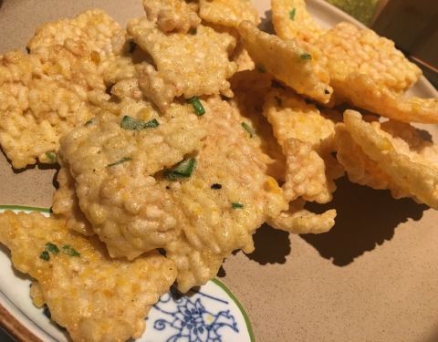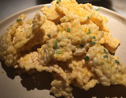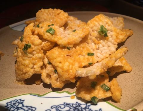 ...用大米爆出来的米花做成的,外面包裹了一层咸蛋黄加一点点的葱花,又松脆又香,非常的好吃,值得推荐