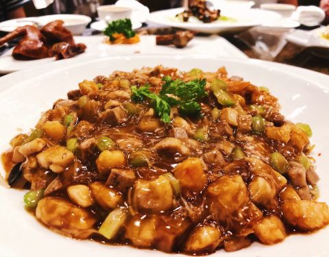 乐忻味之楼,粤菜馆,比较高端。葱香虫草凉拌杏鲍菇,淋上酱汁,一道开胃的凉菜;胶原蛋白花胶汤,很浓稠,满满的胶原蛋白;玻璃乳鸽,表皮十分香脆,肉质香嫩可口。