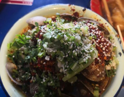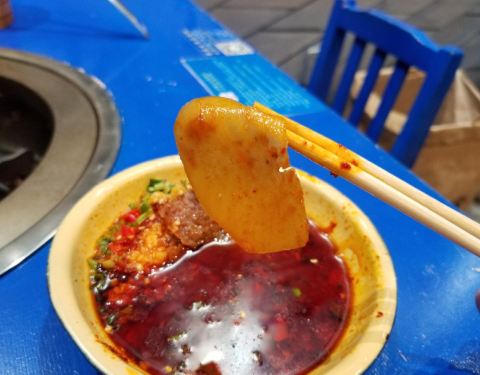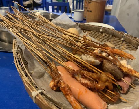 马路边边,一听就是特别接地气的小店,说是串串,也有点像自助麻辣烫,但是是自己烫的,东西都是自己拿的,然后看签子算钱,吃多吃少爱吃啥都来拿,还有他们烤好的冒鸭血也很不错~~~