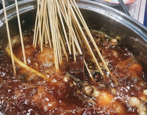 马路边边串串香,大名早就听过了,托点评的福可以免费去体验了。 店家开在人广附近,虽然和南京路还隔着两条街,但店家的人气还是不错的,7点到的门口有等位,等了一个小时。 等位的时候,不断的闻到从店里传出来...马路边边串串香,大名早就听过了,托点评的福可以免费去体验了。 店家开在人广附近,虽然和南京路还隔着两条街,但店家的人气还是不错的,7点到的门口有等位,等了一个小时。 等位的时候,不断的闻到从店里传出来的香气,就连路过的行人也被吸引到了。 店家有两层,等到我的号的时候,恰好一楼有空位。 他家的食材摆放的挺规整,串串放在开放式的冰柜里,盒装的涮菜放在闭合的冰柜里。涮料的种类不多,但吃串串,我觉得只有有花生芝麻碎就可以了。 店家吃串串,是按签子算的,一根签子一元钱,比较喜欢这种的,数数签子吃了多少心里也有数了。 选的大多都是荤菜,比较喜欢培根包芹菜和小香肠。 其实吃串串并不一定是味道有多好,只是在沈腾的辣味蒸汽中,感觉到重庆火锅的热情。