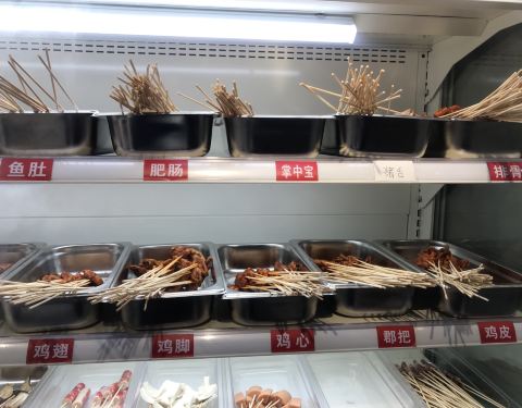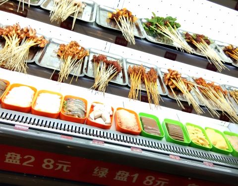 马路边边串串香,大名早就听过了,托点评的福可以免费去体验了。 店家开在人广附近,虽然和南京路还隔着两条街,但店家的人气还是不错的,7点到的门口有等位,等了一个小时。 等位的时候,不断的闻到从店里传出来的香气,就连路过的行人也被吸引到了。 店家有两层,等到我的号的时候,恰好一楼有空位。 他家的食材摆放的挺规整,串串放在开放式的冰柜里,盒装的涮菜放在闭合的冰柜里。涮料的种类不多,但吃串串,我觉得只有有花生芝麻碎就可以了。 店家吃串串,是按签子算的,一根签子一元钱,比较喜欢这种的,数数签子吃了多少心里也有数了。 选的大多都是荤菜,比较喜欢培根包芹菜和小香肠。 其实吃串串并不一定是味道有多好,只是在沈腾的辣味蒸汽中,感觉到重庆火锅的热情。