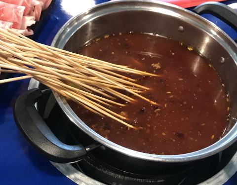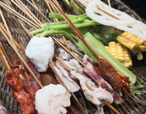 马路边边串串香火锅,这里的吃法是先点锅底,然后再自助拿串串,有个竹簸箕可以放在里面,在火锅锅底...
