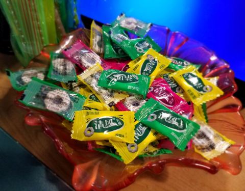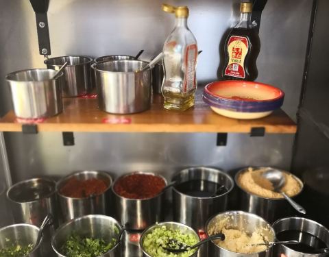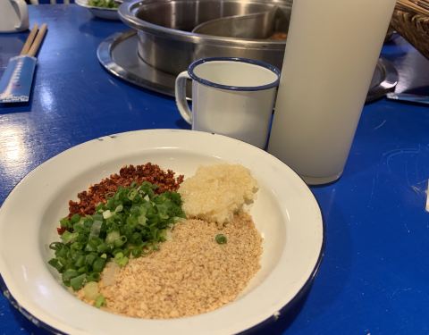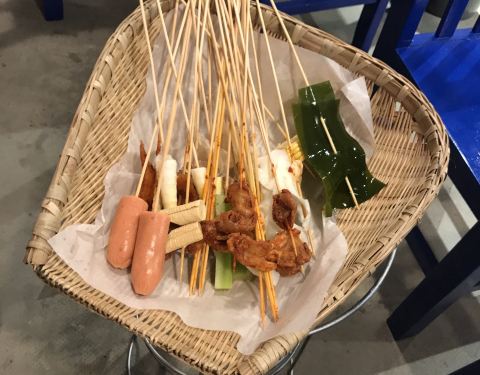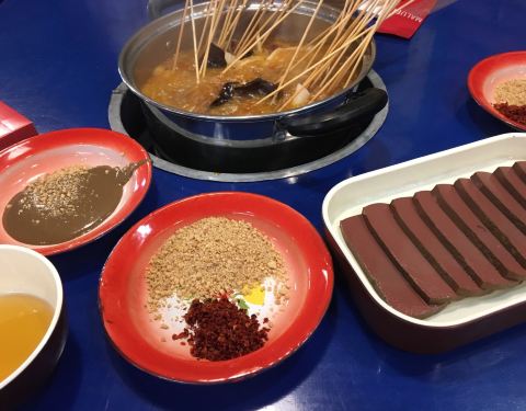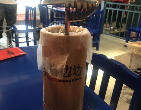 马路边边串串香火锅,这里的吃法是先点锅底,然后再自助拿串串,有个竹簸箕可以放在里面,在火锅锅底里烫一烫就能吃,吃完以后牙签丢在竹筒里,最后要算账的,酱料也是自助的,没有花生酱,(⊙o⊙)…