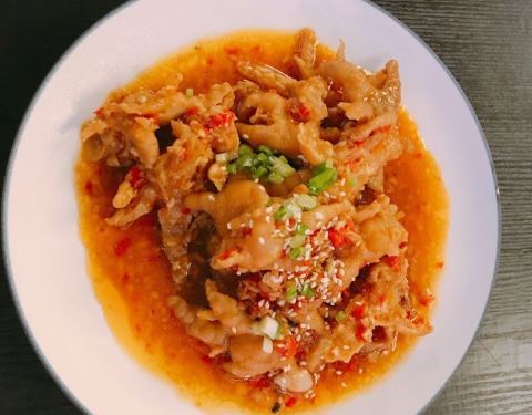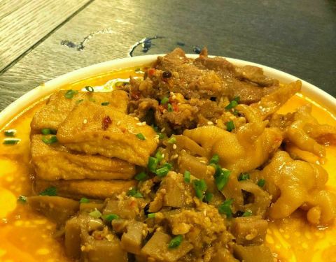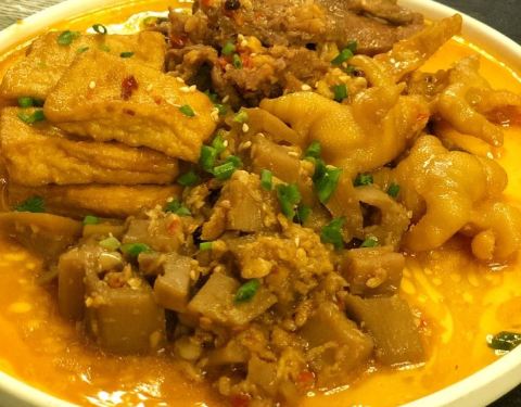 | 土司铜锅油焖鸡 | 微微辣已经够辣,分量超足,小份足以3-4人食用,鸡块几乎没有骨头,每块都是足足的鸡肉,肉质鲜嫩,里面的土豆被炖的酥烂绵密,个人觉得土豆比鸡肉更加入味好吃,拌饭吃更佳! | 鸡爪 牛肉 藕...| 土司铜锅油焖鸡 | 微微辣已经够辣,分量超足,小份足以3-4人食用,鸡块几乎没有骨头,每块都是足足的鸡肉,肉质鲜嫩,里面的土豆被炖的酥烂绵密,个人觉得土豆比鸡肉更加入味好吃,拌饭吃更佳! | 鸡爪 牛肉 藕丁 豆腐蒜香四拼 | 小份拼盘可以一次吃到想吃的菜品,蒜香调味非常棒,非常推荐豆腐!类似于臭豆腐的口感,软软的吸了好多汁水!去骨鸡爪也很有韧性,调味特别棒! | 酸笋炒肉 | 喜欢螺狮粉的小伙伴们一定要点这道菜!完全就是螺狮粉的浇头~酸酸臭臭的超级得劲! | 爆油猪皮 | 第一次尝试吃猪皮,被刀切过的猪皮油炸后看上去像鱿鱼卷似的,一入口就被弹糯的口感惊艳到了!蘸料酸甜口可以解猪皮的油腻,一定要趁热吃冷了就咬不动了。 | 青青芒果丝 | 这道凉菜非常解腻,浇了芝麻酱还是花生酱调味增添了口感,吃完几个辣辣油油的菜之后吃它真的清清爽爽! 这家店的菜全都香咸入味好下饭!不知不觉就扒拉扒拉一碗饭下肚。