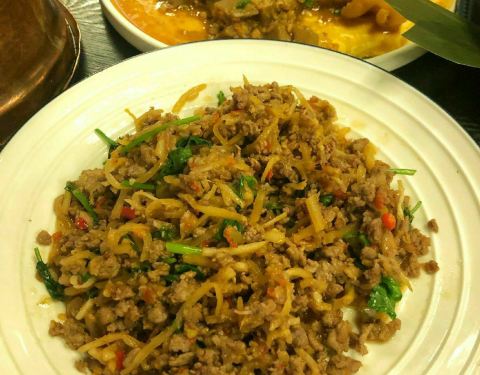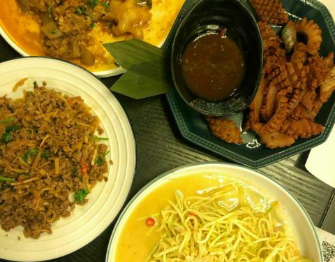火烧云算是闻名已久的店,因为据说等位很厉害,十点多就过来等位了。工作日的中午没想到这么多人,晶品不愧是高级白领的食堂,午餐还能天天排队,大概因为实在太火爆,加个汤要等好久。两个人点了五个菜,基本消灭干净,并不是印象中份量很大的那种傣菜馆,好在味道不错,还吃到了久违的饵丝,毕竟大多数同类餐厅只有米线。