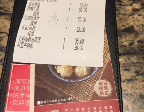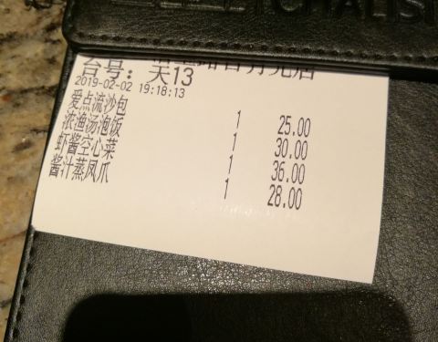 晚上7点多到的,等了一会儿时间,2个人的位置还是比较好安排。过年的原因有些厨师回家了,所以粥没的点了,有些点心也没了。点了份海鲜泡饭,2个人分刚好,胡椒粉放的挺多的,海鲜好像就是一些花蛤;流沙包其实就是奶黄包,凤爪还是不错的;虾酱空心菜很好吃,本来想尝试新品的,但是表姐怕踩雷。