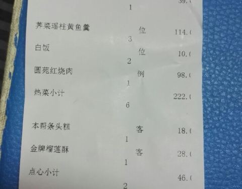 2017年最后一个工作日晚餐。排了一个半小时,逛了两圈。才好不容易轮到。这已是当晚日月光排队算少的一家了,隔壁某家118桌排队,已暂停取号。 快轮到的时候,跟服务员说,我们先点菜吧,下一桌就是我们,坐下就能上菜,不然我爸糖尿病,打了胰岛素,快低血糖了(自备的干粮已吃完)。 门口站了三四个服务员,还吞吞吐吐的,点个菜很难吗? 好不容易有一个服务员拿来笔,准备要写,结果里面让领位,没写成。入座,摆餐具,换人,又叫了好几遍,才来点菜。 还要按冷菜、热菜的顺序上。实在等不了,冲到收银台那边说:先来两碗白米饭!不然人要晕了!但是,白米饭还要走流程,下单,出菜,一道道端出来…… 【榴莲酥】烤过头了吧,皮都快焦了,而且小得一丢丢。 【荠菜黄鱼羹】一例一例计数,有点黄鱼碎肉,还算比较鲜。 【圆苑红烧肉】总算这个招牌没丢人,还是蛮好吃的。肥瘦相间,不腻。但是蛋或百叶结都要另外加钱。 【本帮条头糕】等了很久,以为会是热的,结果上来也是冷的。细成什么样了,也难为厨师搓到这么细。 【桂花糖藕】没什么特别。