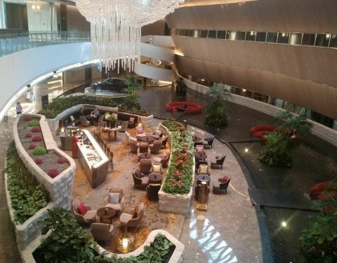 铂瑞酒店的中餐厅也在一楼。整个一楼的大堂是一个弧形的椭圆形。中间像一个湖泊一样是一个水池。人可以步行到水池当中的沙发上坐着休息,给人一种奇特的感受。