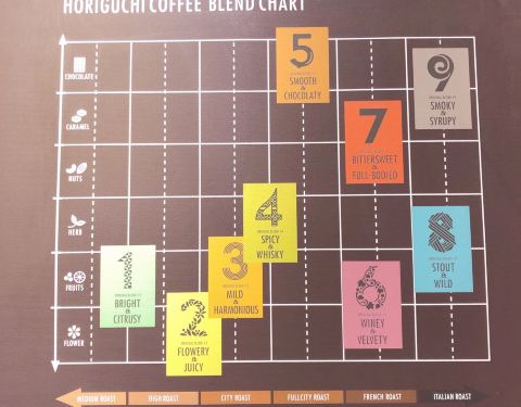 闺蜜推荐的堀口咖啡,今日终于拔草,可能因为是节假日,喝咖啡的人特别多。 日本的堀口先生,是日本精品咖啡之父,是日本顶级咖啡品牌,今日一见果然名不虚传。 墙上有一副九宫格图,咖啡豆根据不同的拼配分成1-9...