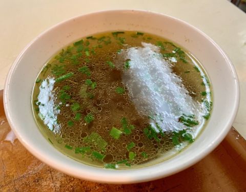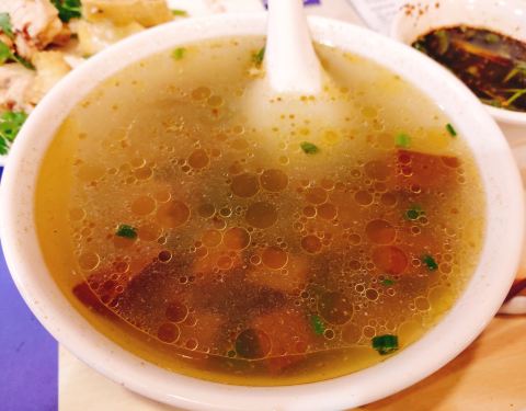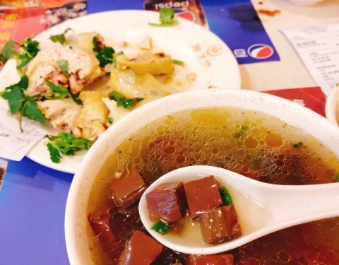 现在我们经常是只吃一家店的招牌,也不用吃饱,然后换一家店再吃一顿。 晚上人还是不少,鸡腿已经买完了,切了四分之一鸡翅。 骨头还是多了些,这个就是这样,同样的量,可你迟到的肉缺不一样多。 味道还是很不错,主要是酱料鲜美。 血汤不错,面一般般。