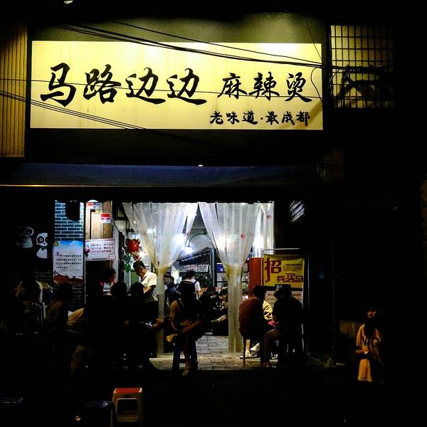 真的是特别特别喜欢他们家的店名,第一次听就觉得很有趣,适合各种梗的植入。 比如,我们在马路边边,吃马路边边麻辣烫。是不是很有趣嘛! 早就被身边人各种刷屏,说生意如何如何好,下午5:30去晚上8点过才可以吃上之类的。 小亚天真的以为,过了这么长时间,还开了这么多分店,应该也就不排队了吧。 结果昨天晚上和小伙伴去吃晚饭的时候,那排队的阵仗哦,吓死宝宝了。 还好,我们去得早,还有空位。等我们吃完出来,寒风中那些坚强的排队人儿,让我肃然起敬。 【锅底】很多人说,这家麻辣烫是老成都的味道,吃起来特别带感觉,加上店内的复古怀旧装修和餐具搭配,确实很有童年的记忆。可是小亚 不是老成都,所以不懂。 于我来说,这麻辣烫锅底是走的比较温和的路线,油香却不腻,吃完嘴巴没有任何不适,身上也不残留余味。 【干碟】干碟是特色,辣椒面分两种,自己可以选择。黄豆花生粉很香。还有小米辣啊、香菜、醋、葱蒜等,可以自己随意搭配。重口味看到这个也就心安了。 所以,小亚我成功吃完5个干碟!哈哈! 【串串】荤菜品种还是多丰富的,推荐:嫩得很自然的麻辣牛肉,烫够时间会特别耙软的猪皮、越烫越好吃的儿菜、脆脆嫩嫩的笋子、大家都很喜欢的掌中宝、骨头稍微大点的排骨段 等等 【小份冒菜】必点的是嫩牛肉,只是牛肉片真的好少,2份都不够吃;冒脑花有软又绵还特入味;连豆芽菜都很入味很好吃的冒火锅粉; 【蛋炒饭】虽然特色不足,但是作为主食建议来一碗,米粒蛋花咸香可口,毫不油腻,可可分明,一小碟吃完肯定没问题的。 昨晚吃太开心了。还有什么我是忘了的,你自己去体会吧。反正尽量早点去!不重复强调了! 排队排久了,影响用餐心情,我可不管哦!