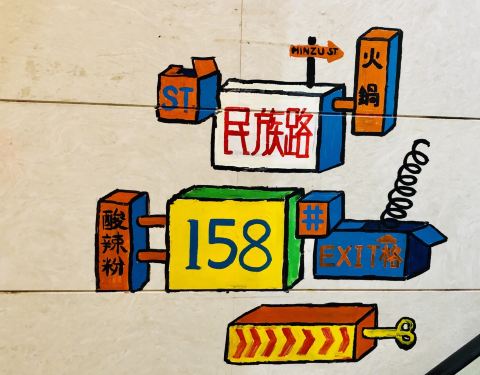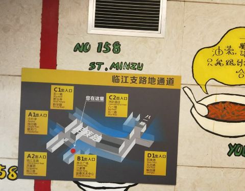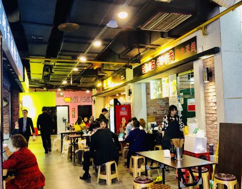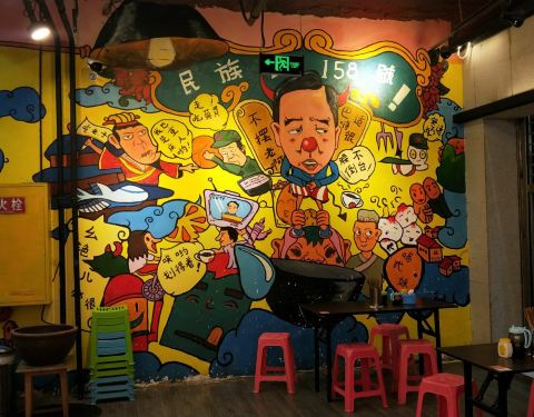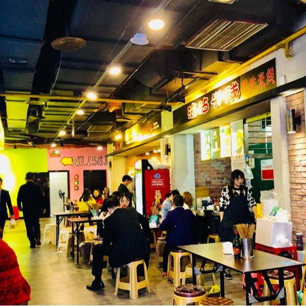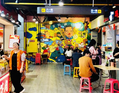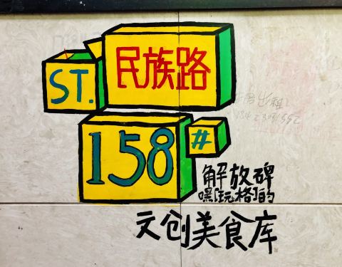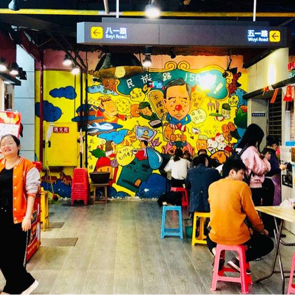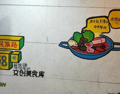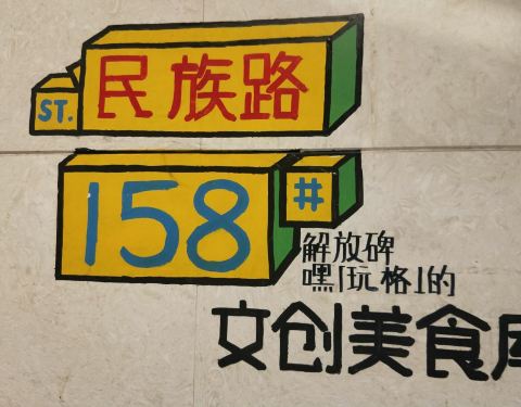 地下文创美食广场•民族路158号好吃街 晚上步行去解放碑的路上,首先经过的就是这个民族路158号好吃街 其实是被他的墙上壁画吸引了眼球,画的很卡哇伊但也很重庆哦,总体来说还是被好奇心驱赶下,走到了地下通道里面,但是整体环境在地下,难免有一些闷热。 •坐标:临江支路2号 •交通:地铁/公交车站小十字站•9口 •环境:地下一层的位置,相对来说没有地上那么清爽,最大的特色就是文创,所以墙上有很多好看的壁画,还有中庭的装修,还是有文艺的,毕竟这是一条文创美食街。 总的小吃有哪些种类呢?还是很有重庆风格的,主要还是串串、重庆小面、小火锅、钵钵鸡、还有一些饮料店,还是要天气清爽一些的时候来这里吃饭更舒服一些,现在有点点焖,不过这也是解放碑附近值得打卡的美食街了。
