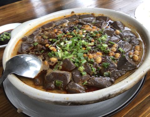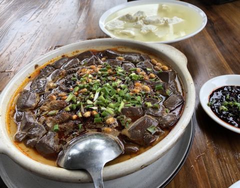 崇州市地处岷江中上游,川西平原西部,是一座因水而兴的城市。元通古镇位于崇州西,是一座历史悠久的国家4A景区。古镇上最有名的小吃有叶耳巴、冻糕等,最有名的菜品有肥肠血旺、石磨豆花等。今天中午游玩古镇后在何血旺饭馆用餐,两个人点了一份石磨豆花,一份肥肠血旺,味道还不错,价格32元也算比较实惠。
